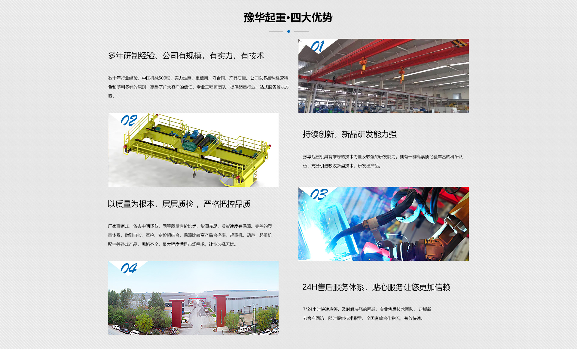 临沂豫华起重自成立以来,公司以起重机销售为基础,现已发展成为集起重机械、电动 葫芦、减速机等产品装备的销售企业。